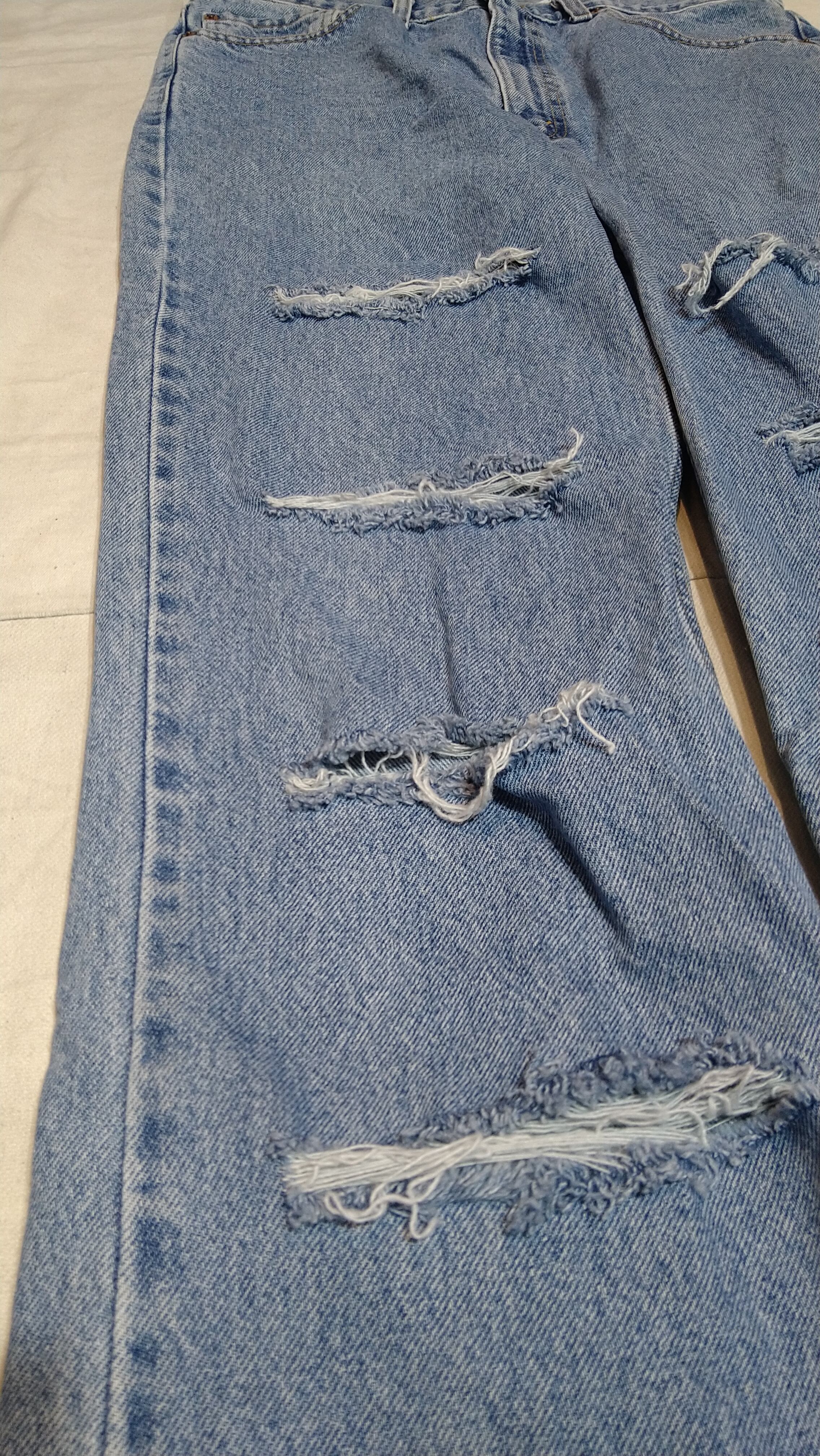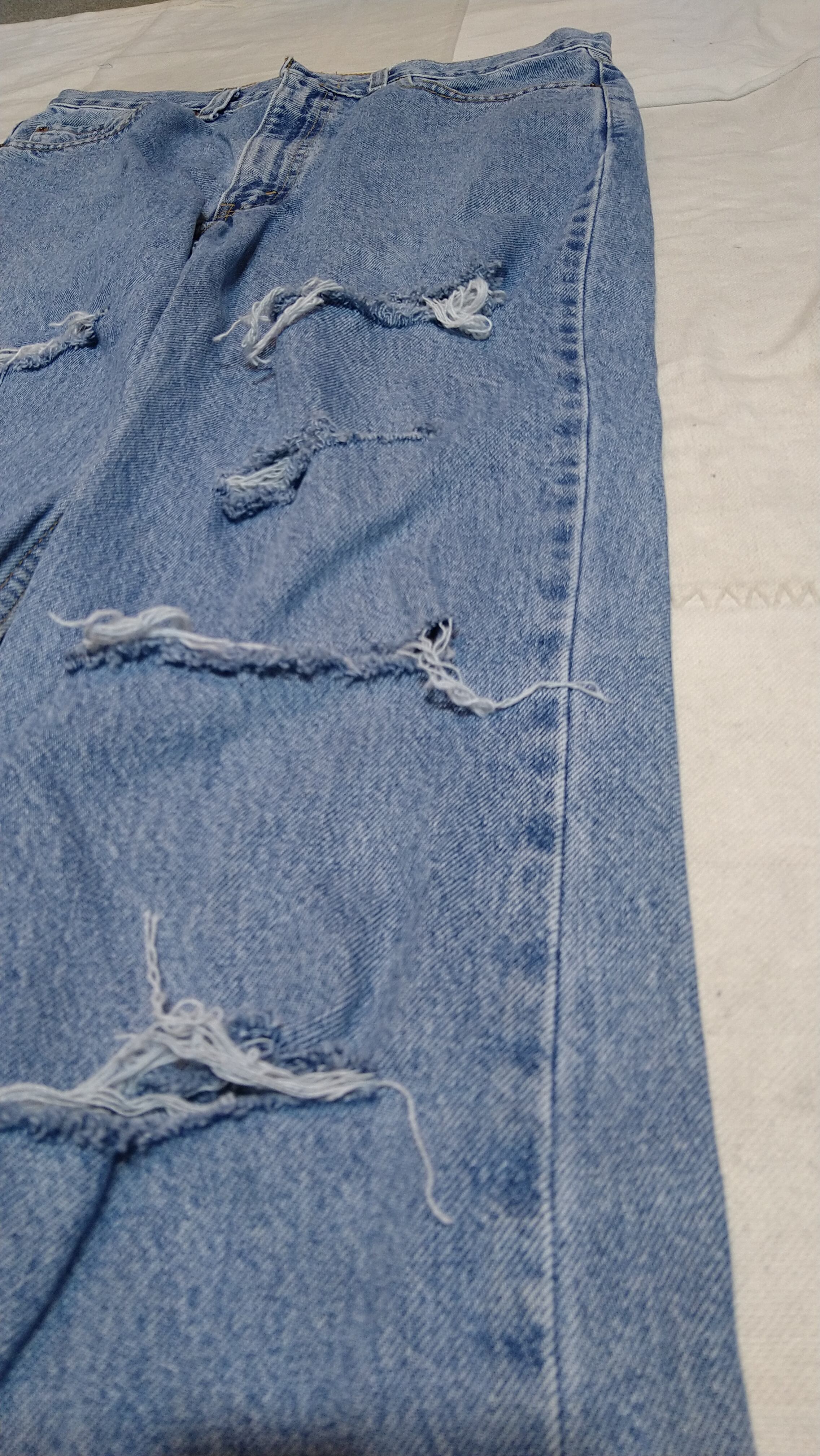 腿から膝下にかけて、破いてダメージ加工を施しました。
